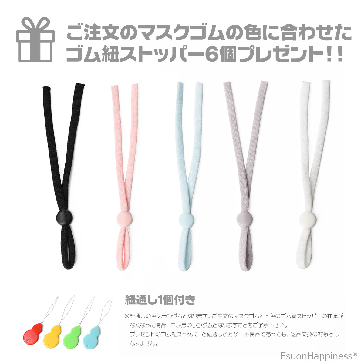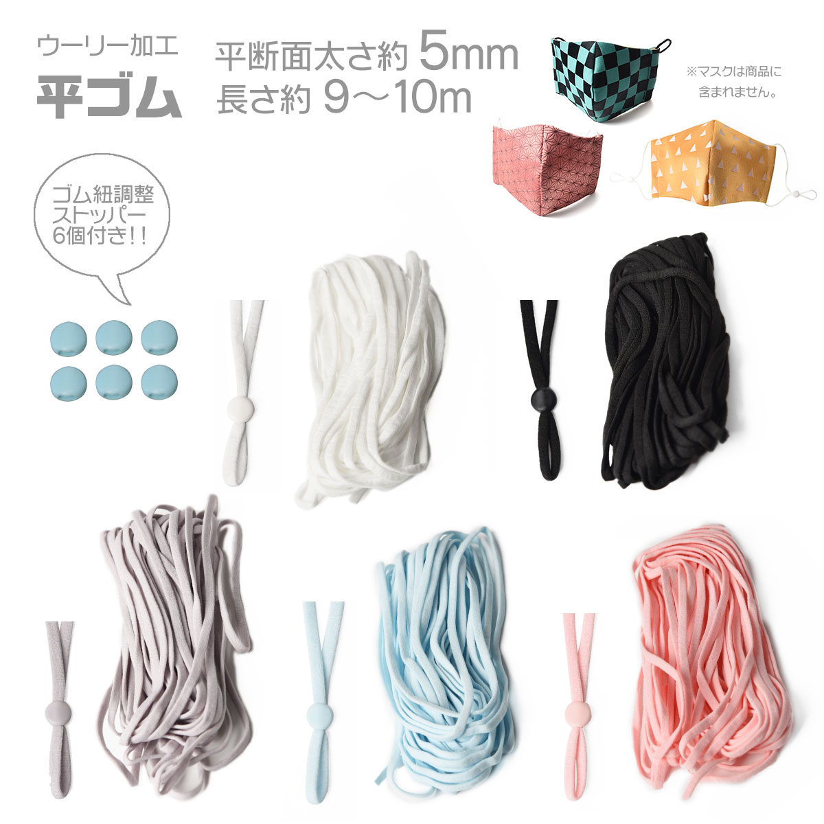 マスクゴム 平ゴム 太さ 5mm 長さ 約 10m 5色選べる マスク ゴム ひも マスク用 紐 ウーリー ゴム紐ストッパー 付き 手作り 柔らかい 痛くない